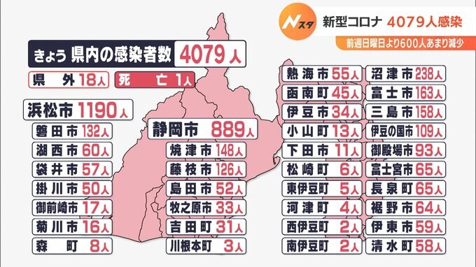 8月14日、静岡県内では新たに4079人が新型コロナウイルスに感染したことがわかりました。感染者を自治体別に見ますと、浜松市で1190人、静岡市で889人、沼津市で238人などとなっています。県の発表によ…