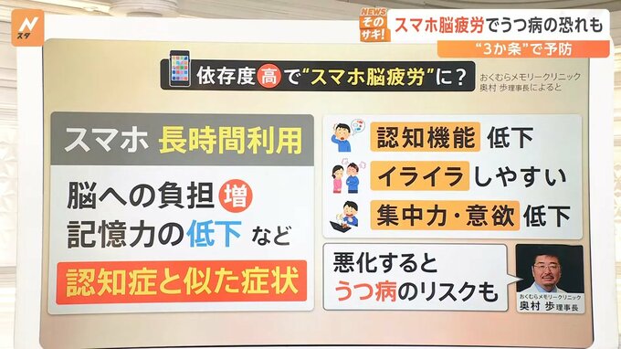 おくむらメモリークリニックの奥村歩理事長によると、スマートフォンの長時間利用は、▼脳への負担が増え、記憶力の低下などがあるそうで、認知症と似た症状になりがちだそうです。