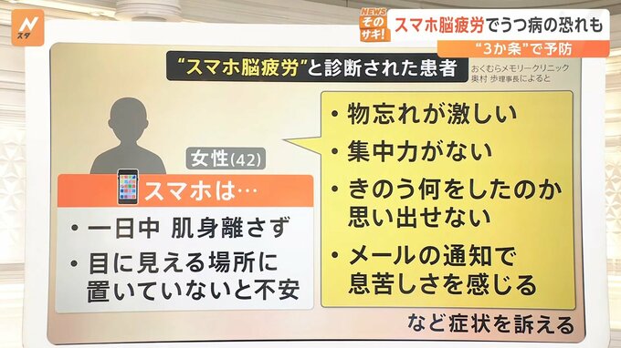 さらに女性は、▼物忘れが激しい、▼集中力がない、▼きのう何をしたのか思い出せない、▼メールの通知で息苦しさを感じるなどの症状を訴えていました。