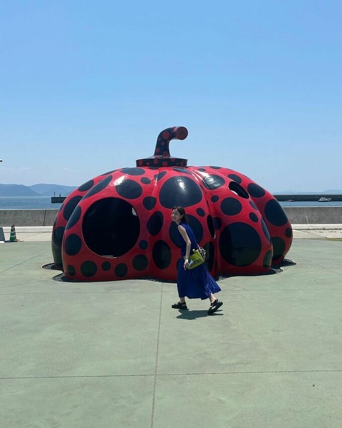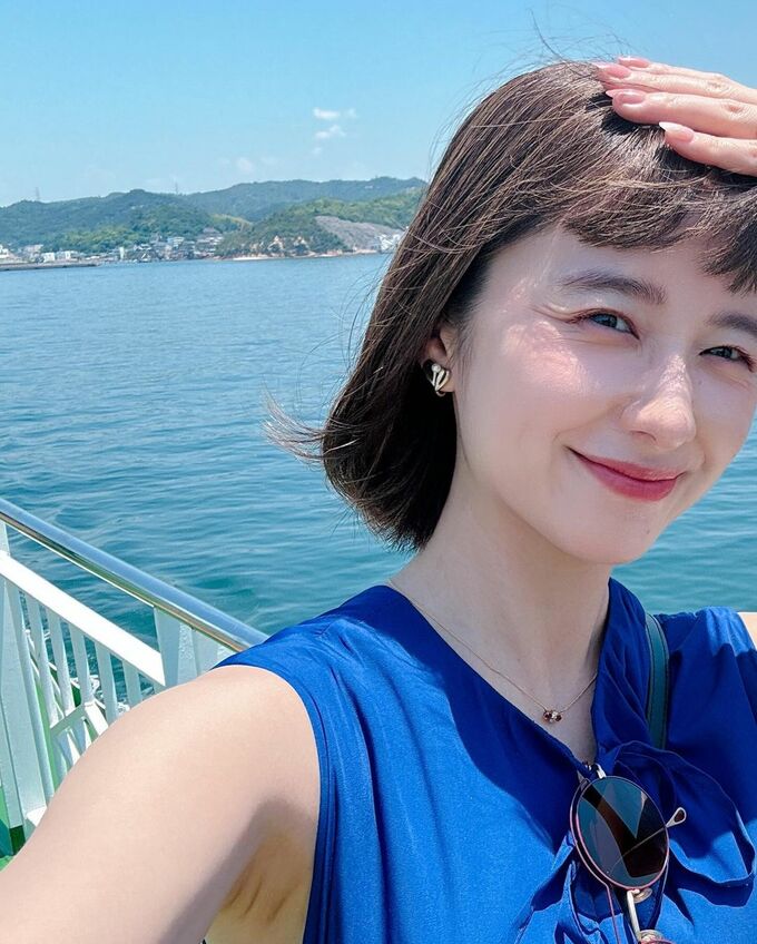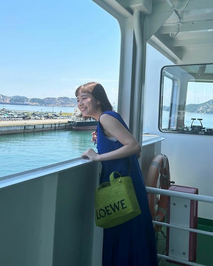 香川県の直島でオブジェの前で笑顔の写真や、船の中での写真では以前のセンター分けの前髪とは雰囲気をガラリと変えた眉毛上の前髪を作っており、【オン眉】姿を披露しました。
