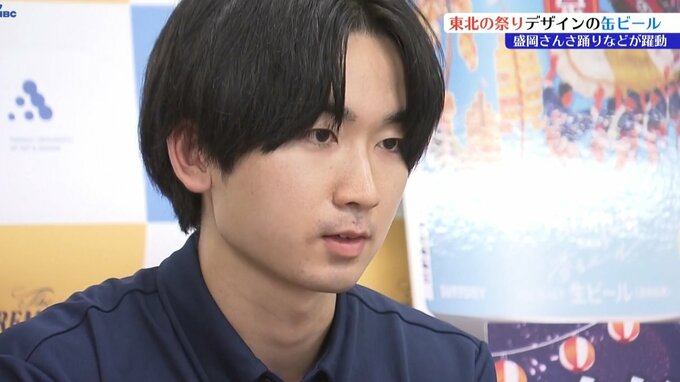 サントリーは東北地方を代表する祭りの魅力を多くの人に知ってもらおうと2021年から東北芸術工科大学と共同でデザインした缶ビールを販売しています。きょうの会見では、デザイン缶に描かれる東北6県の祭りのうち、盛岡さんさ踊りのイラストを手がけた一関市出身で東北芸術工科大学グラフィックデザイン学科3年の千葉優斗さんが「躍動感あるデザインに仕上げられた。東北の祭りに親しみを持ってほしい。」と、デザインに込めた思いを語りました。