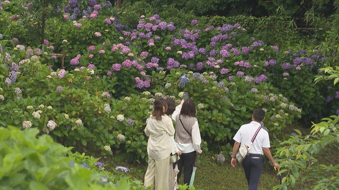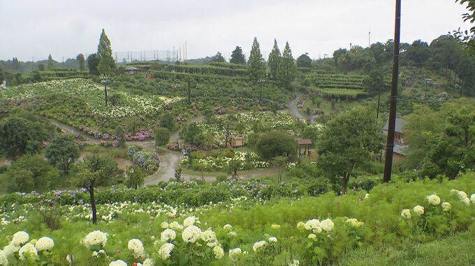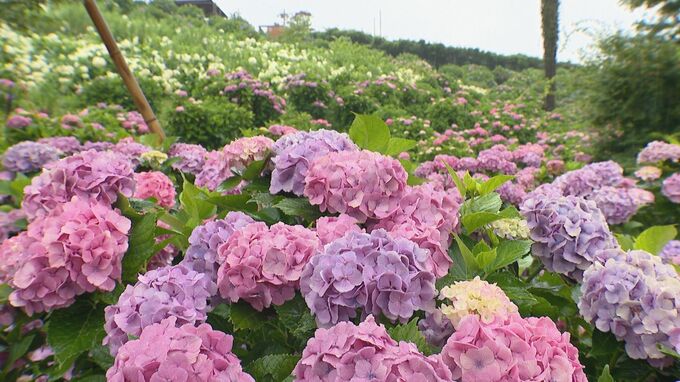 三重県津市の「かざはやの里」。約7万7700株、45種類のアジサイが雨の季節を待ちわびたように、色づき始めました。