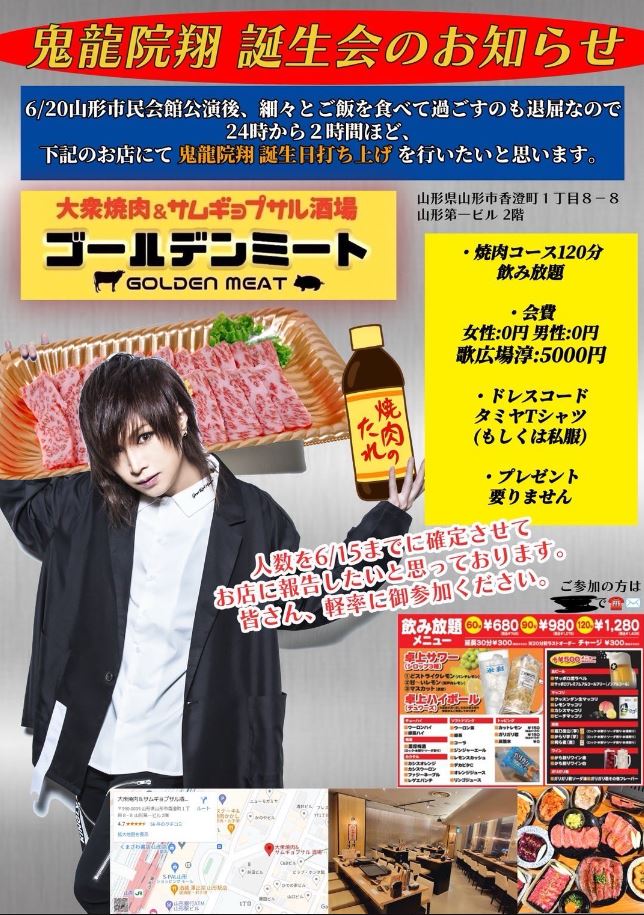 チラシには翔さんがお肉を担いでいる巧みな合成ショットに、簡潔で分かりやすい宴会スペックが記されており、なんと会費はメンバーの歌広場淳さんを除いて男女ともに「0円」という大盤振る舞い。ライブの開催日は6月20日・一方でチラシには「6/15までに確定させてお店に報告したいと思っております」と、実は周到に準備していることをうかがわせています。