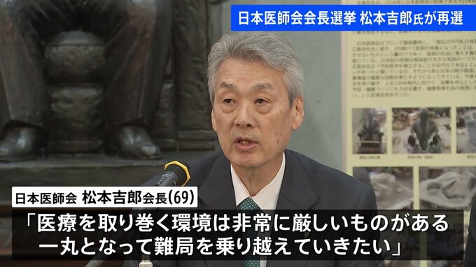 任期満了に伴う日本医師会の会長選挙が行われ、現会長の松本吉郎氏が元副会長の松原謙二氏を破り、再選を果たしました。(日本医師会館 午前11時ごろ)「会長、松本吉郎くん」日本医師会 松本吉郎 会長(69)「…
