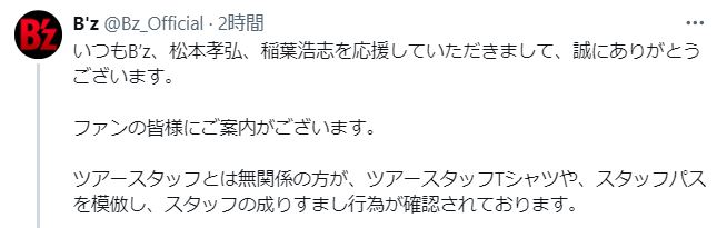22日、ロックバンド「B'z」の公式Xアカウントが「ツアースタッフの成りすまし行為」が確認されたと警告を発しました。