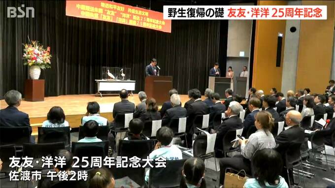 トキのペア友友(ヨウヨウ)と洋洋(ヤンヤン)が中国から贈られて25年となったのを記念して、新潟県佐渡市でセレモニーが行われました。