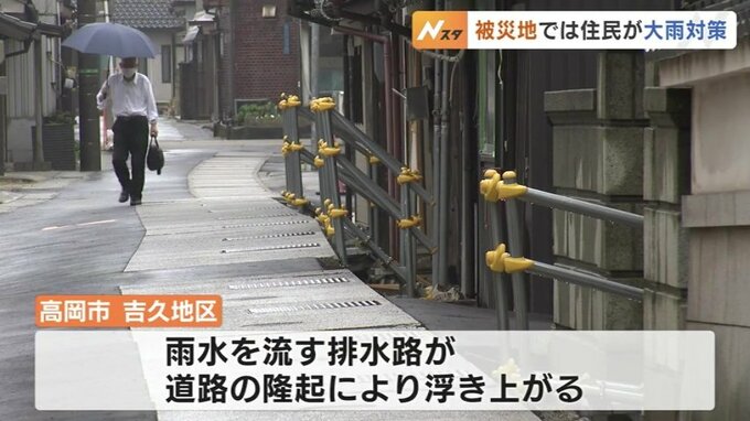 能登半島地震による液状化で地盤沈下や道路の隆起が深刻な富山県高岡市の吉久地区では、住民が自宅前に土のうを積み大雨に備えていました。