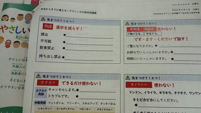 たとえば私たちがなんとなく使っている「大丈夫です」という言葉や、「ここではちょっと…」などの会話が日本語初級の人には意味不明になるため、はさみの法則で「いいです」「だめです」などに置き換えるように教えられました。こうした練習は、私たちが日常使っている言葉を改めて考えるきっかけにもなります。