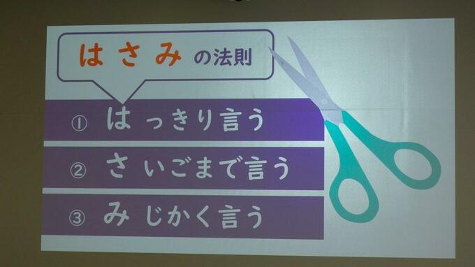 「はっきり言う」「さいごまで言う」「みじかく言う」の3つです。「はっきり」「さいごまで」「みじかく」の頭文字をとって「は・さ・み」の法則です。