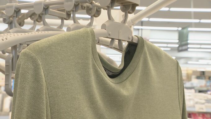 梅雨対策グッズの中でも、特に洗濯物関連の売れ行きが好調とのこと。6月に発売されたばかりのハンガーは、洗濯物を吊るす部分に穴が。