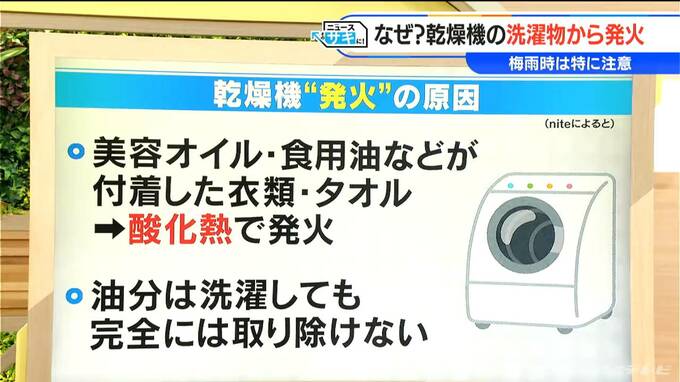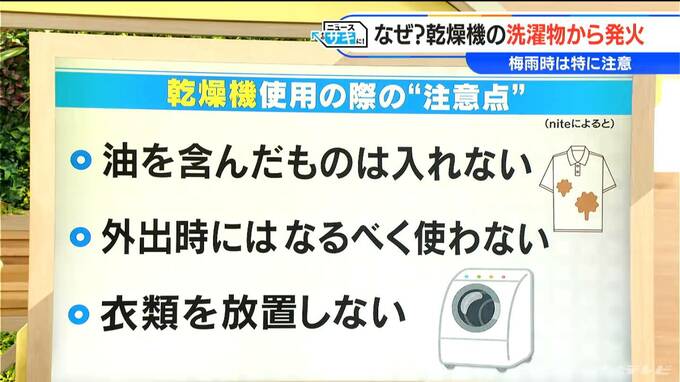 製品評価技術基盤機構niteによりますと、乾燥機の事故というのは梅雨時の今、6月から増える傾向に。乾燥機付き洗濯機で洗濯物が自然発火するおそれがあるんです。