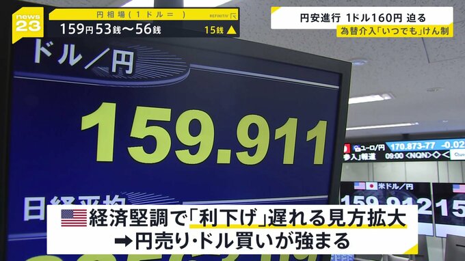週明けの外国為替市場で円相場は、一時1ドル=160円に迫る場面がありました。アメリカ経済が堅調で、利下げが遅れるとの見方が拡大し、より高い金利で資産を運用しようと円売り・ドル買いの動きが強まりました。財…