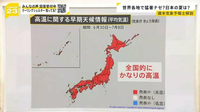 気象庁は24日、「高温に関する早期天候情報(平均気温) 期間:6月30日~7月8日」を発表しました。『全国的にかなりの高温』が予想されるといいます。