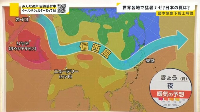 世界各地で異変が起きているのですが、その原因が上空の風にありそうです。サウジアラビアからインドにかけて、冷たい空気と暖かい空気の間を通る風=偏西風が大きく蛇行しているのですが、偏西風は大きく蛇行すればするほど、蛇行した部分に熱い空気がたまりやすく、サウジアラビアからインド周辺、また日本も影響を受けて平年よりも暑い空気が入っているという状況です。