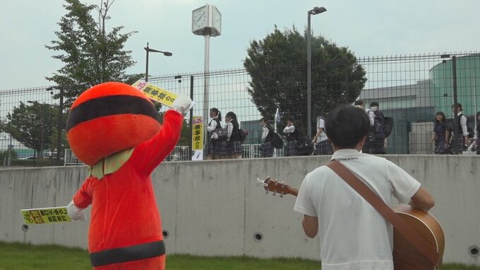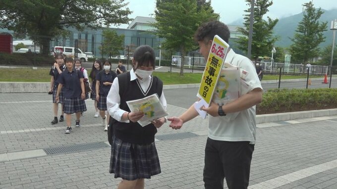 25日朝、関係者15人が市川三郷町の県立青洲高校の正門に立ち、登校する生徒にボールペンや、高齢者の横断に注意を呼びかけるチラシを配りました。