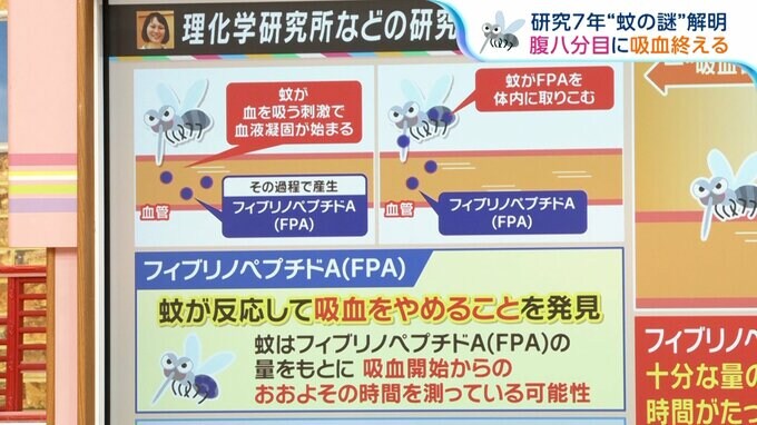 この「FPA」を蚊が体内に取り込むことによって、吸血をやめることが佐久間氏らの研究によって明らかになりました。