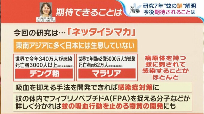 今後、研究により吸血を抑える手法を開発できれば、感染症対策になると期待されています。