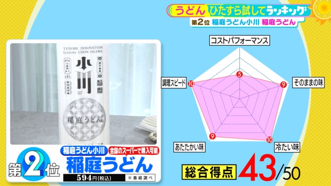 日本三大うどんの一つといわれる秋田名産の稲庭うどん。手延べ製法の平たい麺が特徴で、5回も熟成を繰り返しながら、4日間かけて1本1本手作りで仕上げている。「調理スピード」部門では、14種類の平均が約12分50秒だったところ、冷凍うどんに匹敵する速さの2分48秒を記録。さらに、しなやかで弾力のある食感とのどごしの良さも高評価で、清水アナは「噛んだらしっかり弾力がある、のどごしもいい、余韻も最高。こんなにパーフェクトなことありますか!?」と驚愕。「冷たい味」部門でも1位となり、山下さんは夏野菜の揚げ浸しとあわせて、ぶっかけうどんで楽しむことをおすすめした。