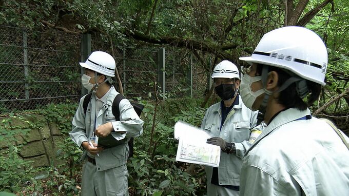 点検に訪れたのは岡山市の職員や防災の知識を持つボランティアらです。岡山市北区津島笹が瀬の養護老人ホームの裏にあるこの場所は、土砂崩れなどが起きた際に住民に危険が生じる恐れがあるとされる土砂災害警戒区域に指定されています。
