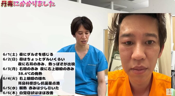 しゅんPさんは「6月6日の木曜日。丹毒発症して5日目ぐらいかな。この時には、もうだいぶ良くなってきました。ただやっぱり『赤み』は残っていて、今もこういうふうに、『赤み』は続いてますね。なので今、ペニシリン系の抗生剤をちゃんと1日3回で、飲んでおります」と、語りました。