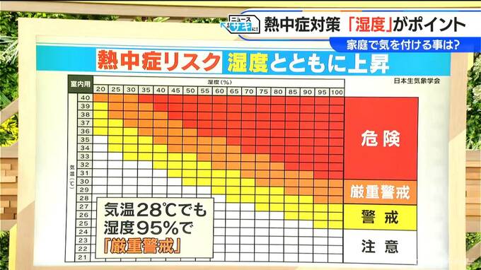 (柳沢彩美アナウンサー)熱中症警戒リスクの程度を示したグラフでは、例えば「気温28℃・湿度95%」の場合は「厳重警戒」になります。気温だけでなく、湿度の数値がいかに大事かというのがわかります。