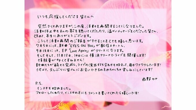 西野さんは「突然ではありますが、この度活動を再開することになりました。」と、報告。
