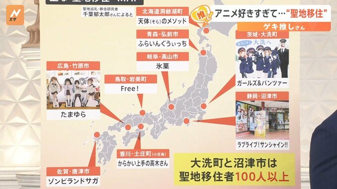 “聖地”は全国各地にあり、特に茨城県大洗町と静岡県沼津市は聖地移住者が100人以上いるということです。