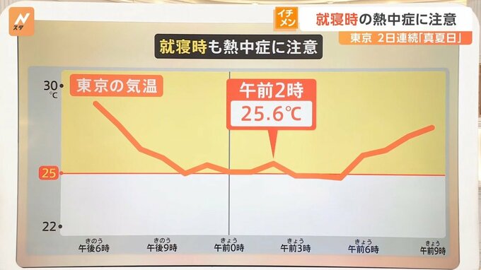 就寝時も熱中症に気をつけなくてはいけません。東京は24日の夜から25日の朝にかけて、午前2時に気温25.6度を記録するなど、25度前後で推移していました。夜間の気温が25度以上を「熱帯夜」といいますから、この時期はほぼ熱帯夜といえる状況です。