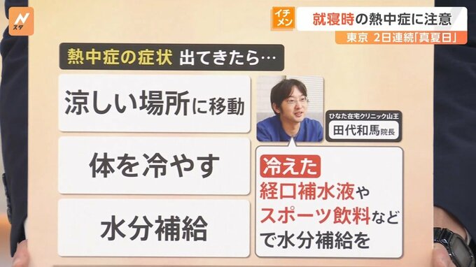 田代院長は、▼涼しい場所に移動、▼体を冷やす、▼水分補給といった対応を挙げ、「冷えた経口補水液やスポーツ飲料などで水分補給を」としています。冷えた水分のほうが体温を下げやすいということです。