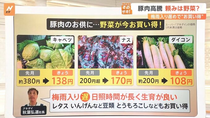 野菜はお買い得だということです。5月と比べると、アキダイでは6月25日時点でキャベツは約380円から138円に、ダイコンは約200円から108円になっています。