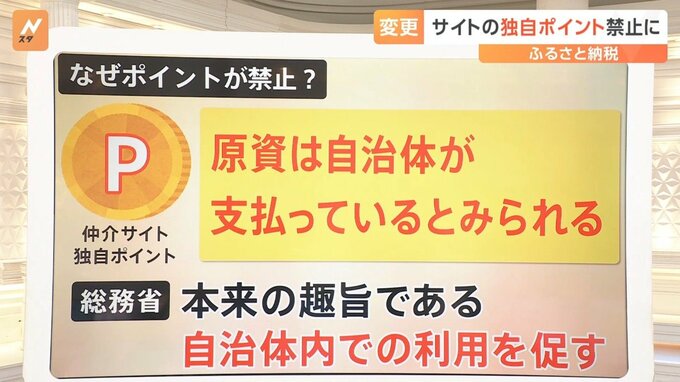 仲介サイトの独自ポイント、原資は自治体が支払っているとみられていて、公平性としてもよくないということがあるようです。総務省は「本来の趣旨である自治体内での利用を促す」ということです。