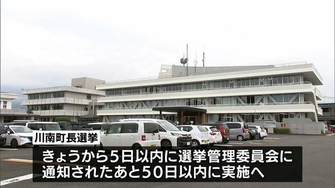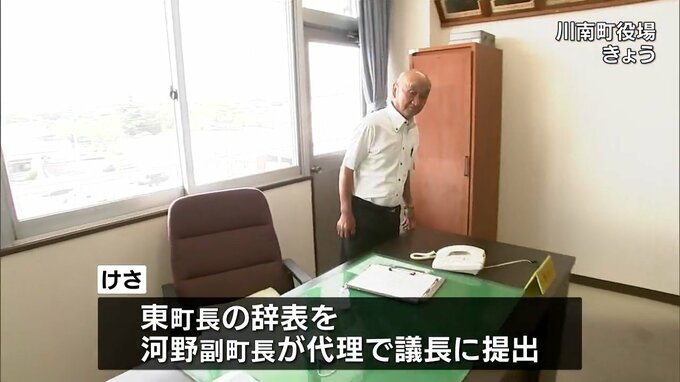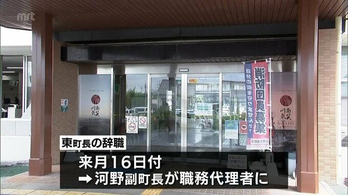 東町長の辞職は来月16日付けで、河野副町長が職務代理者となり、町長選挙は26日から5日以内に選挙管理委員会に通知されたあと、50日以内に行われることになります。