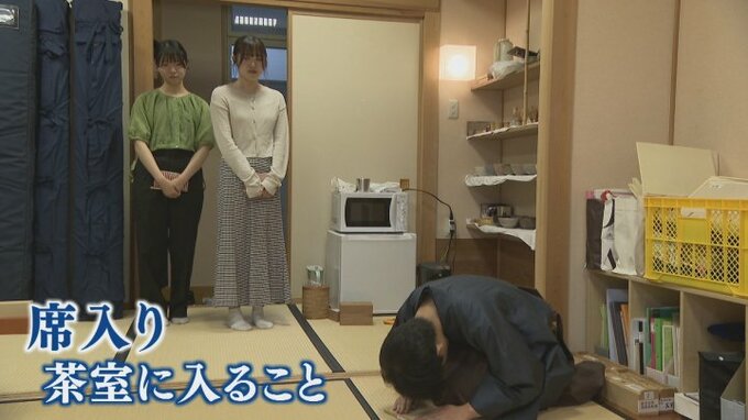 県立大学の和室では、茶道部員も手伝って稽古の準備が進められています。