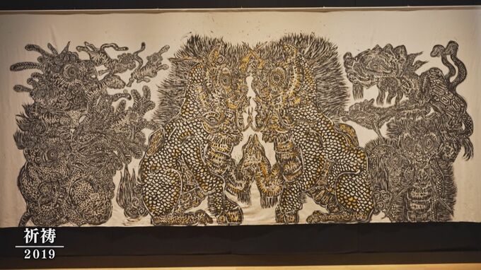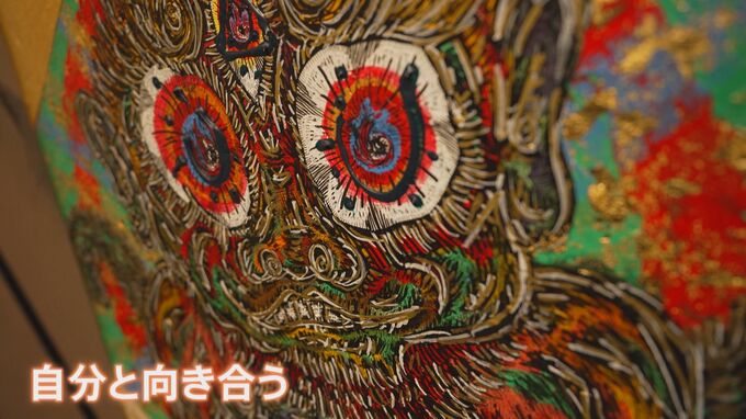 祈りを捧げる。キャンバスに直に塗りつける。体温をこめ、全身で描く。自身が作品と一体になっていく。観衆の目の前で行う「ライブペインティング」など、様々な技法で作品を生み出しています。小松さんが描く神獣には見る人をハッとさせる力強さがあります。