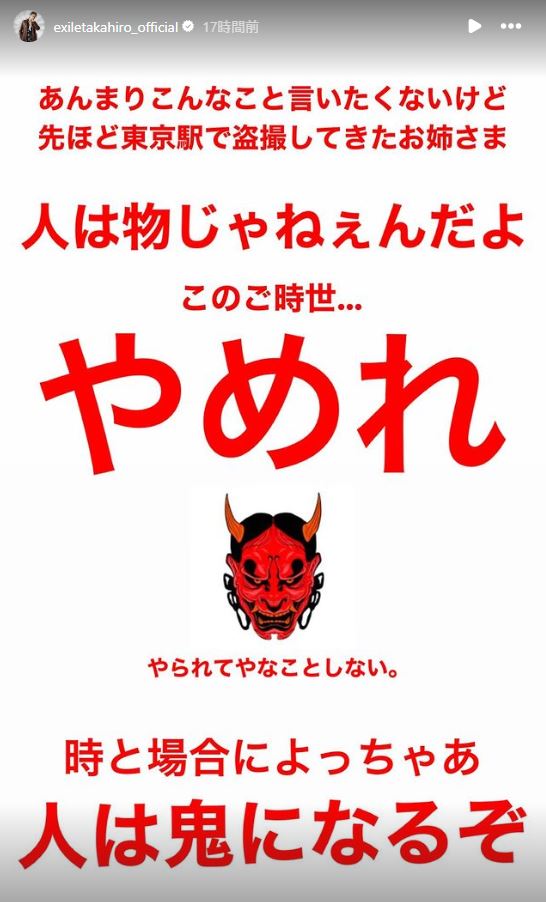 TAKAHIROさんは「あんまりこんなこと言いたくないけど 先ほど東京駅で盗撮してきたお姉さま」と呼びかけ「人は物じゃねぇんだよ」「このご時世…やめれ」と大書、さらに鬼の面のイラストも加えて、ストーリーズに投稿しており「時と場合によっちゃあ 人は鬼になるぞ」と、怒りを露わにしています。