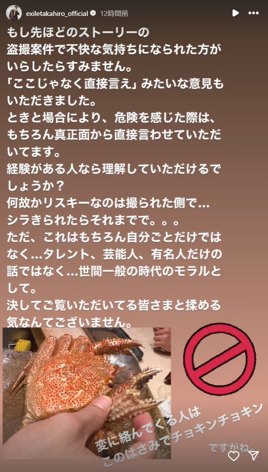 25日、EXILE TAKAHIROさんが自身のインスタグラム・ストーリーズに、盗撮行為に関する怒りを投稿し、モラルの改善を訴えました。