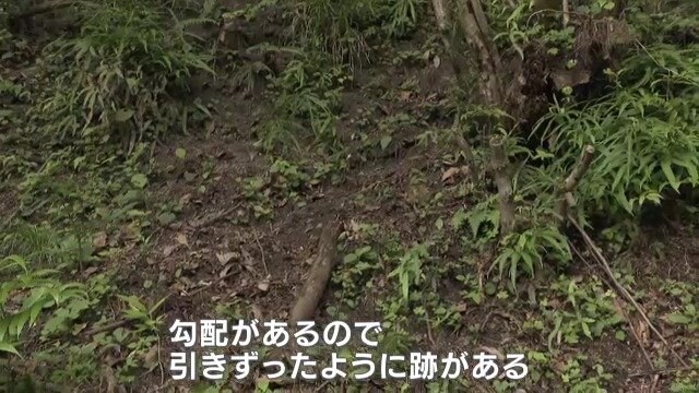 「この跡がそうだと思う。勾配があるので、引きずったような跡がある」