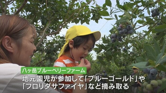 26日は北杜市高根町の保育園児約15人が参加して、粒が大きくて甘味が強い「フロリダサファイヤ」などをカップいっぱいに摘み取り、味の違いなどを楽しんでいました。