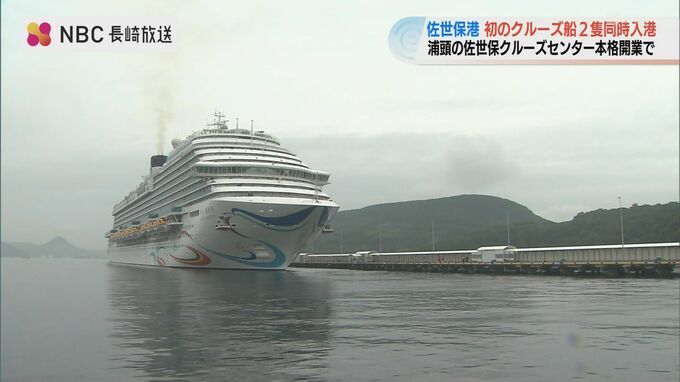 佐世保港浦頭のクルーズ客船用ターミナルが今月、本格開業したのに伴い、26日、長崎県の佐世保港にクルーズ客船が初めて2隻、同時入港しました。26日朝の佐世保港浦頭。入港してきたのはアドラ・マジック・シティ…