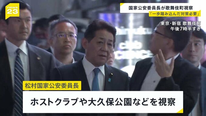松村国家公安委員長は今夜、新宿・歌舞伎町で、ホストクラブや売春目的の客待ちが問題となっている大久保公園などを見て回りました。視察後、松村氏は悪質ホストクラブをめぐり、「一歩踏み込んだ対策が必要」との…