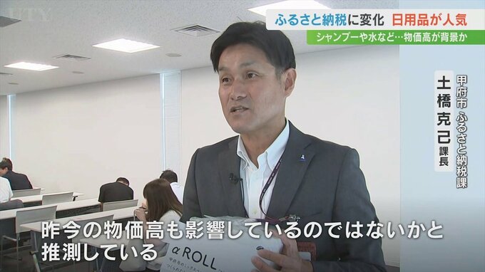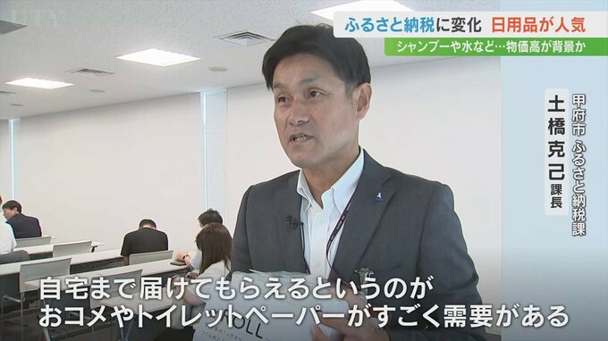 甲府市のふるさと納税アドバイザー山田穂高さんによりますと、物価高が続いているため、ふるさと納税の返礼品に高級な嗜好品ではなく日用雑貨やコメなどを選ぶ人が増えているということです。