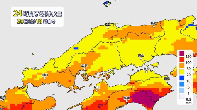 中国地方では、28日未明から夜遅くにかけて大雨となる見込みです。土砂災害、浸水害、河川の増水に十分注意してください。