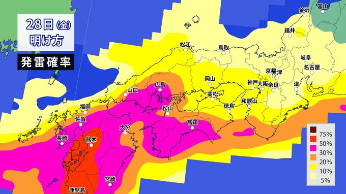 28日未明から夕方にかけて、断続的に雷を伴った激しい雨が降る見込みです。雨雲が予想以上に発達した場合には、警報級の大雨となる可能性があります。
