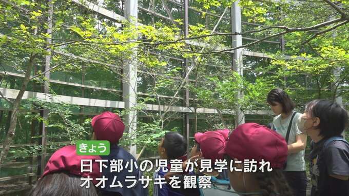 27日は山梨市の日下部小の児童が見学に訪れ、今まさに羽根を広げようとしている様子や、スモモなどの果物が置かれたエサ場に群がるオオムラサキを興味深そうに観察していました。