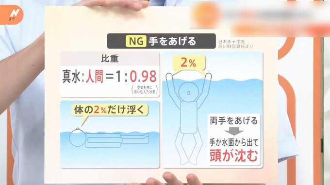 真水と人間の比重は基本的に1対0.98で、体の2%だけが浮くということになります。両手をあげてしまうと手の部分が浮く2%になり、頭が沈み息ができなくなってしまうということです。