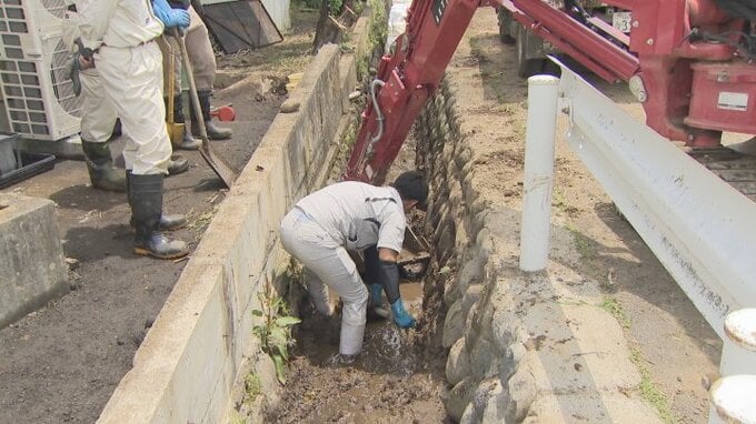 27日、施設ではJAや市の職員などが油の沁み込んだ土の撤去や仮設の水路を設置する作業に追われていました。