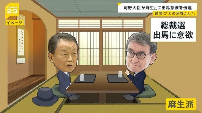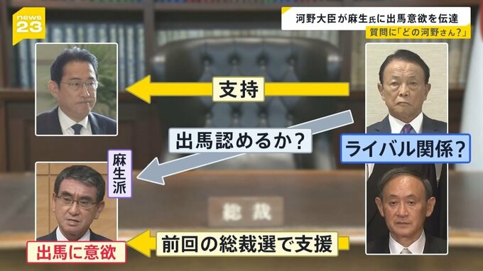 岸田総理を支えてきた麻生氏が、河野氏の総裁選出馬を認めるかどうかは未知数。河野氏は、前回の総裁選で支援を受けた菅前総理も頼りたい考えとみられます。ただ、菅氏と麻生氏はライバル関係とされることもあり、河野氏は難しい2択を迫られる可能性もあります。