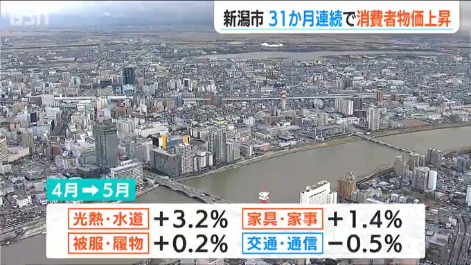 4月との比較では光熱・水道が3.2%、家具・家事用品が1.4%と上昇が止まらず総合指数では、これで31か月連続の上昇です。