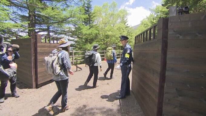 5合目の登山道入口には仮設ゲートが設置され、7月からの夏山シーズン中は24時間体制で警備員が配置されます。
