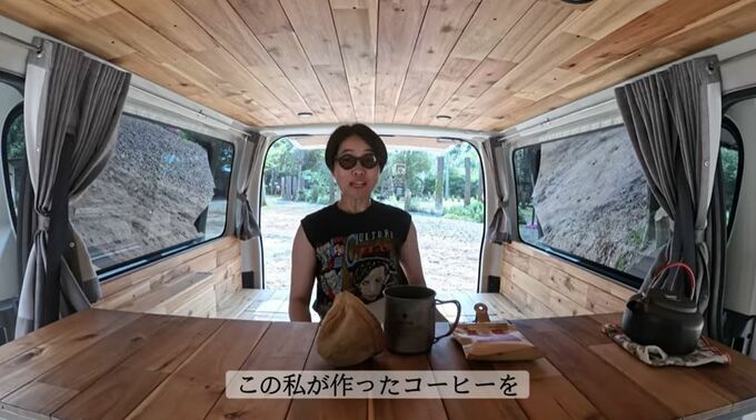 今回の動画は、イモトさんが人気のワンボックスカー「ハイエース」のカスタムカーを借りてキャンプに興じるシリーズの最終回。カスタムカーは内壁と天井を天然木材で覆い、室内灯を完備して、車中泊も可能なうえに、フロアボードをテーブルとして立ち上げて車内をカフェのようにもできる豪華な仕様です。